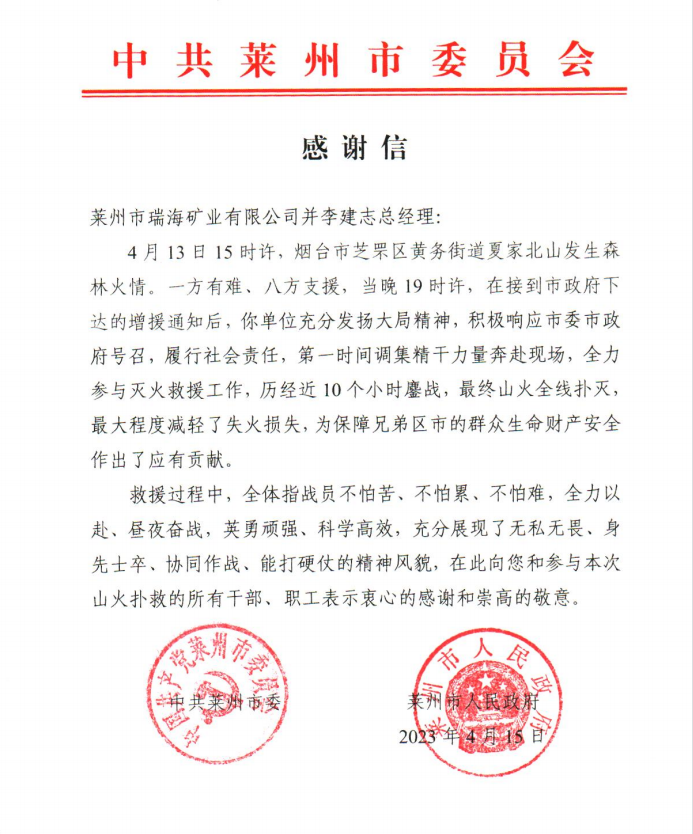 日前,莱州市瑞海矿业有限公司收到了莱州市委市政府送来的感谢信,对企业积极响应号召,履行社会责任,调集精干力量扑救森林山火做出的贡献表示感谢。
